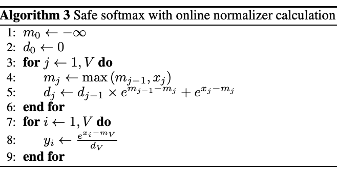 Online Softmax只需要两次read(遍历一次x并维护最大值和归一化因子)和一次write,核心思路如下:
