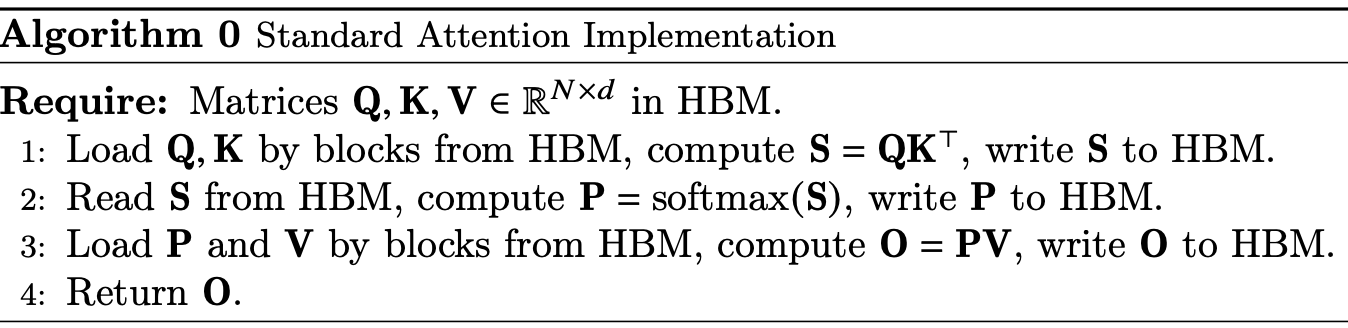 Transformer的核心计算是Attention,朴素的Attention计算步骤如下,其中一般$N \gg d$,复杂度是$N^2$,在长序列频繁读写(5read & 3 write)大矩阵时非常依赖HBM: